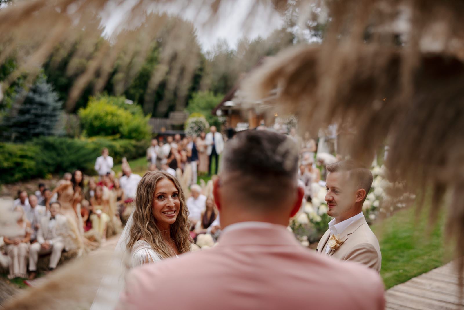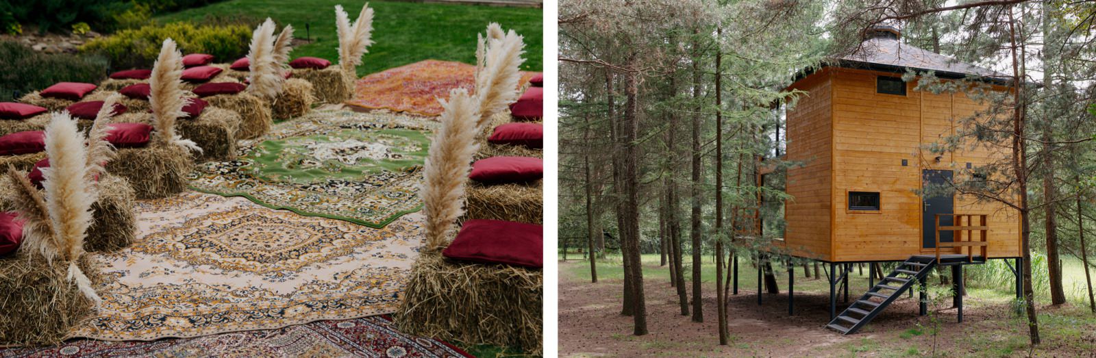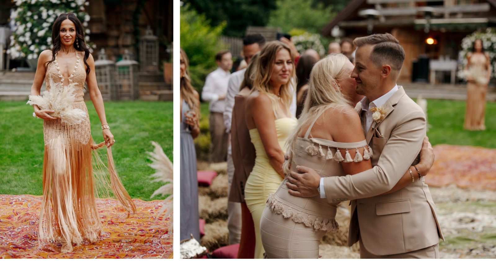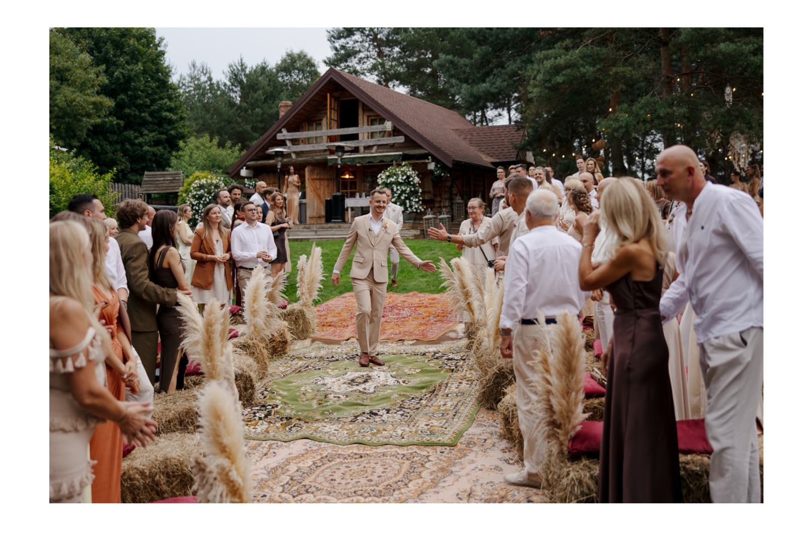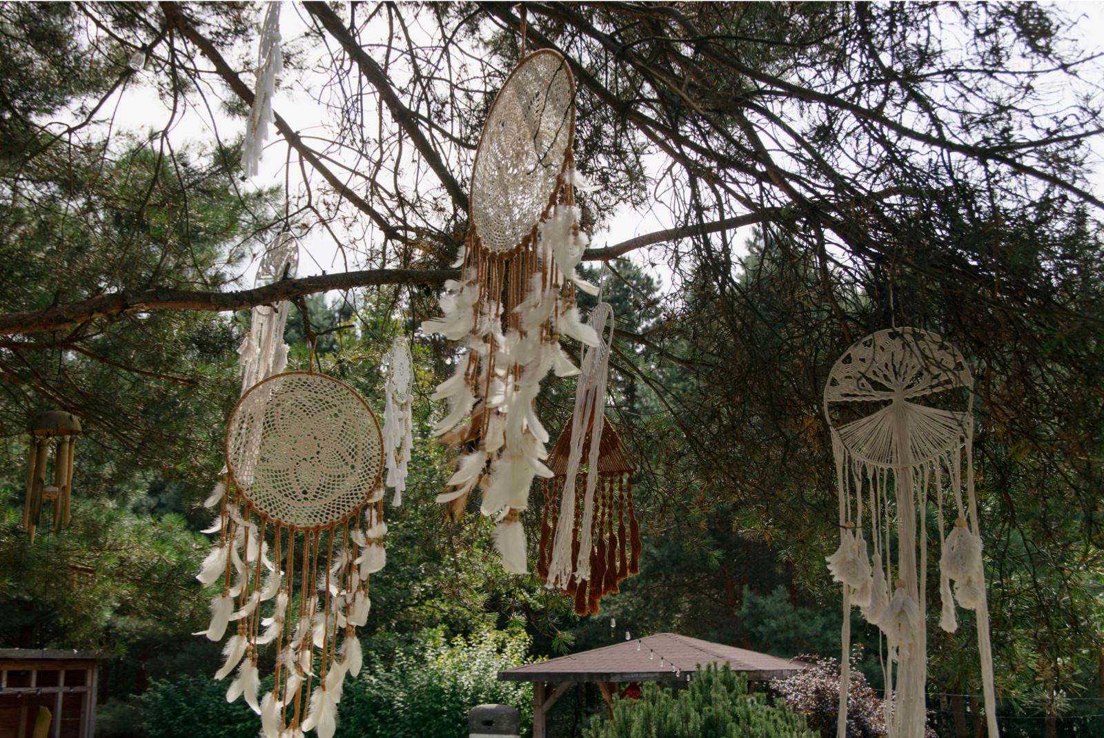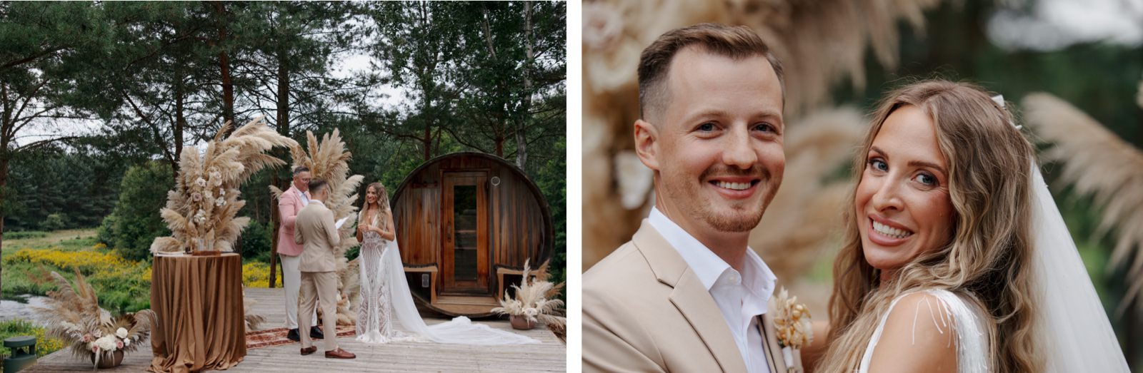 Był więc domek na drzewie, w którym przygotowywały się dziewczyny. Była najpiękniejsza panna młoda w najpiękniejszej sukni ślubnej boho z frędzlami i koronką. Zamiast tradycyjnego bukietu - wachlarz z trawy pampasowej. I pan młody w eleganckim beżu. Kompleksowo przygotowany teren na ceremonię przy ostatnich promieniach słońca, z widokiem na rzekę. Barwne dywany na świeżo skoszonej trawie, goście siedzący na snopkach siana. Tańce pod gwiazdami i totalny luz. Prywatna działka, basen i chill w rytmach elektroniki.
