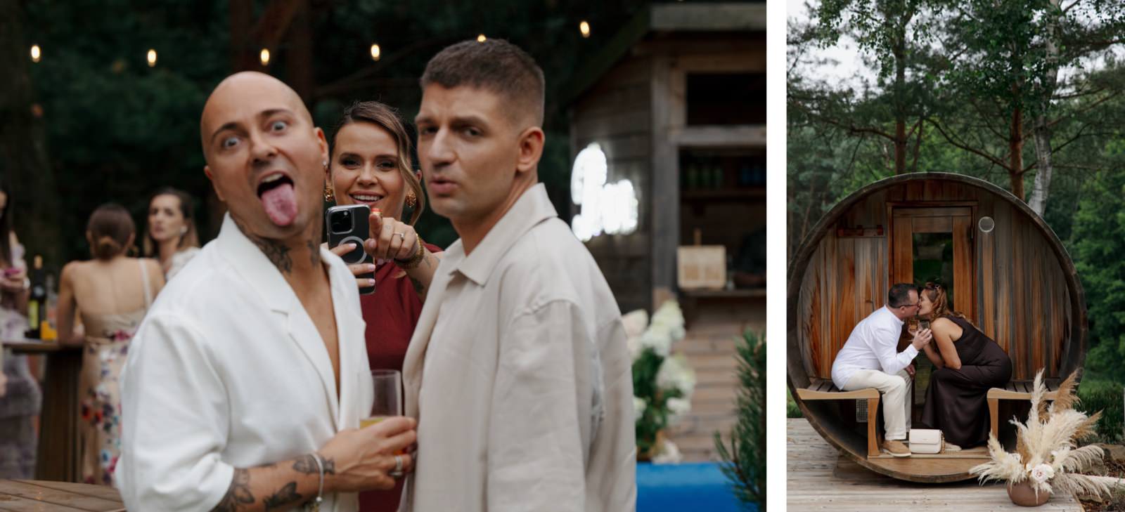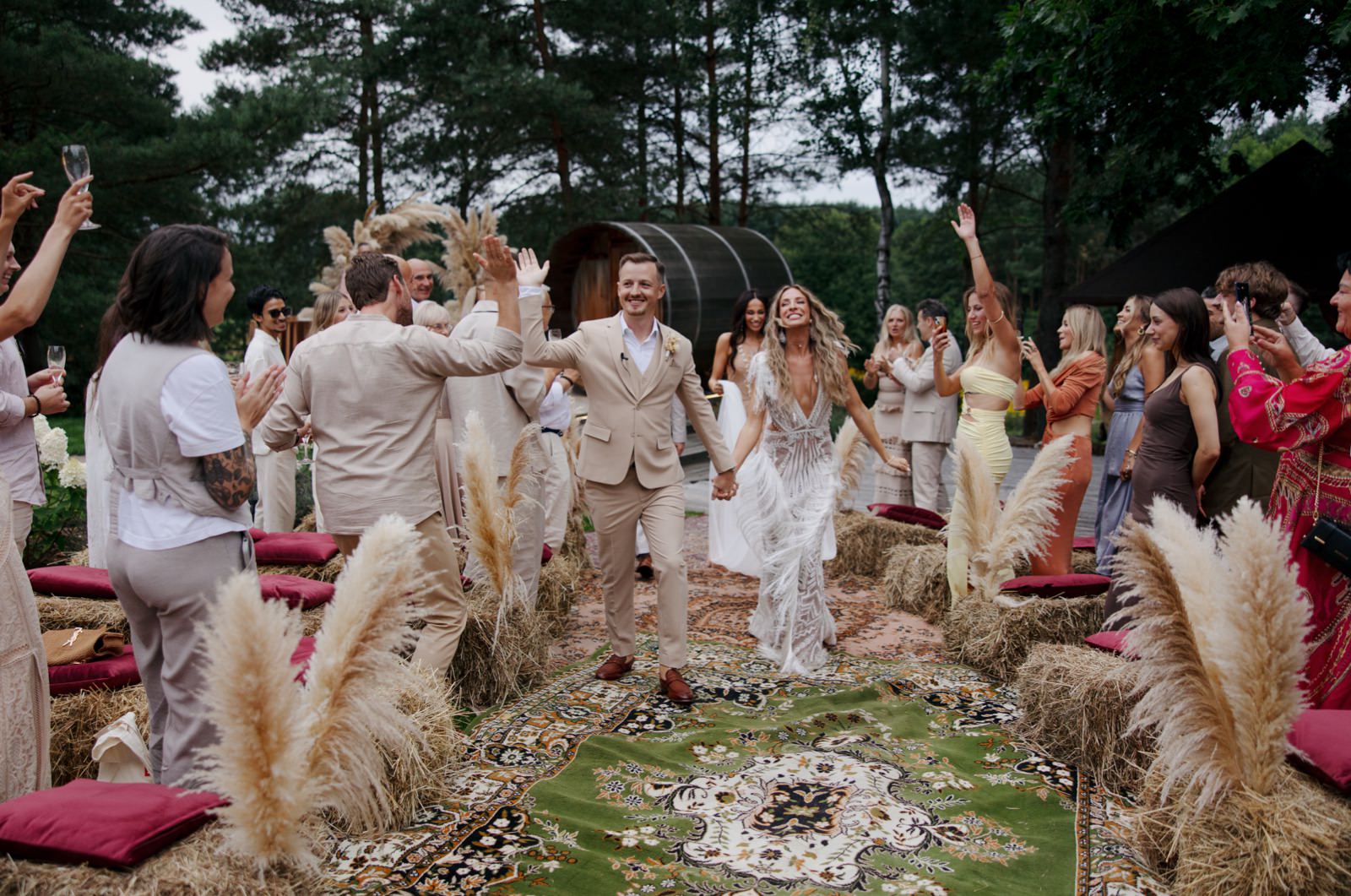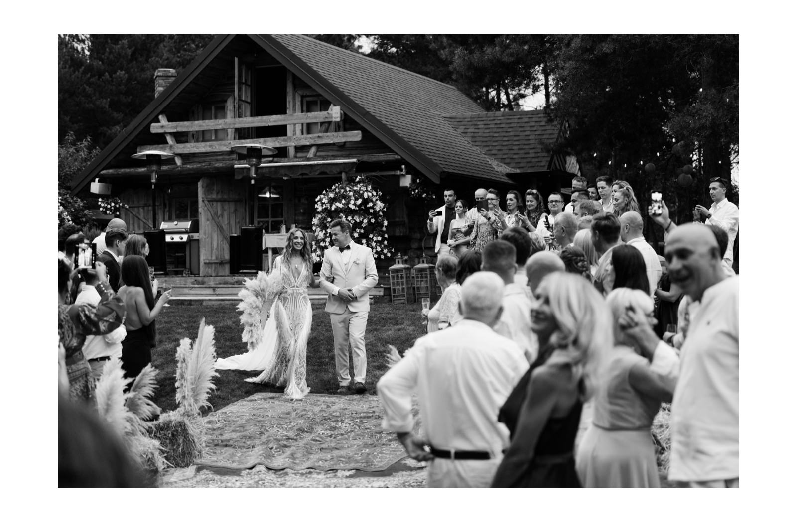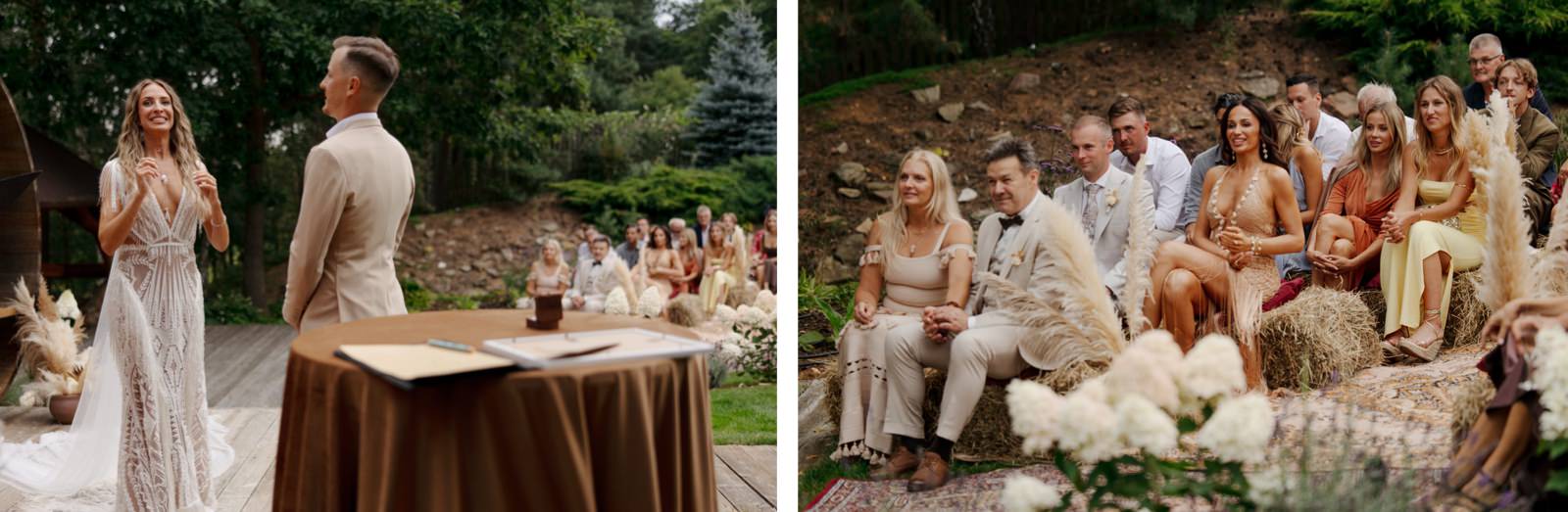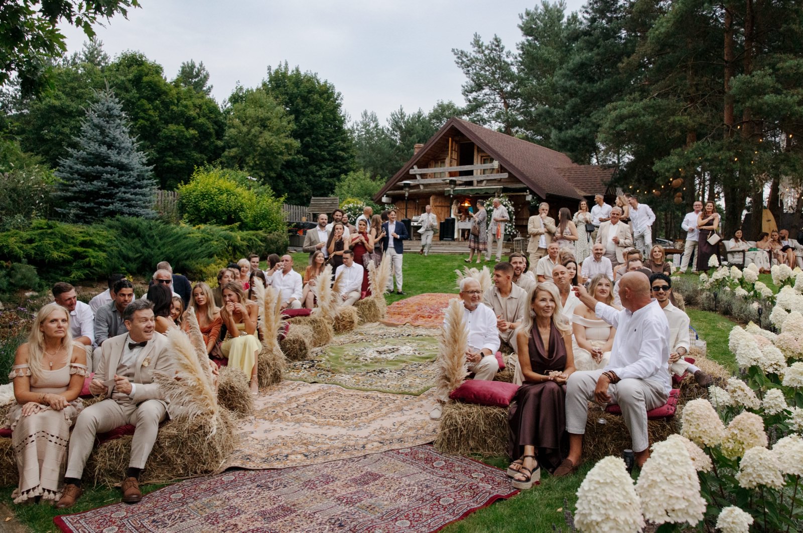 Był więc domek na drzewie, w którym przygotowywały się dziewczyny. Była najpiękniejsza panna młoda w najpiękniejszej sukni ślubnej boho z frędzlami i koronką. Zamiast tradycyjnego bukietu - wachlarz z trawy pampasowej. I pan młody w eleganckim beżu. Kompleksowo przygotowany teren na ceremonię przy ostatnich promieniach słońca, z widokiem na rzekę. Barwne dywany na świeżo skoszonej trawie, goście siedzący na snopkach siana. Tańce pod gwiazdami i totalny luz. Prywatna działka, basen i chill w rytmach elektroniki.