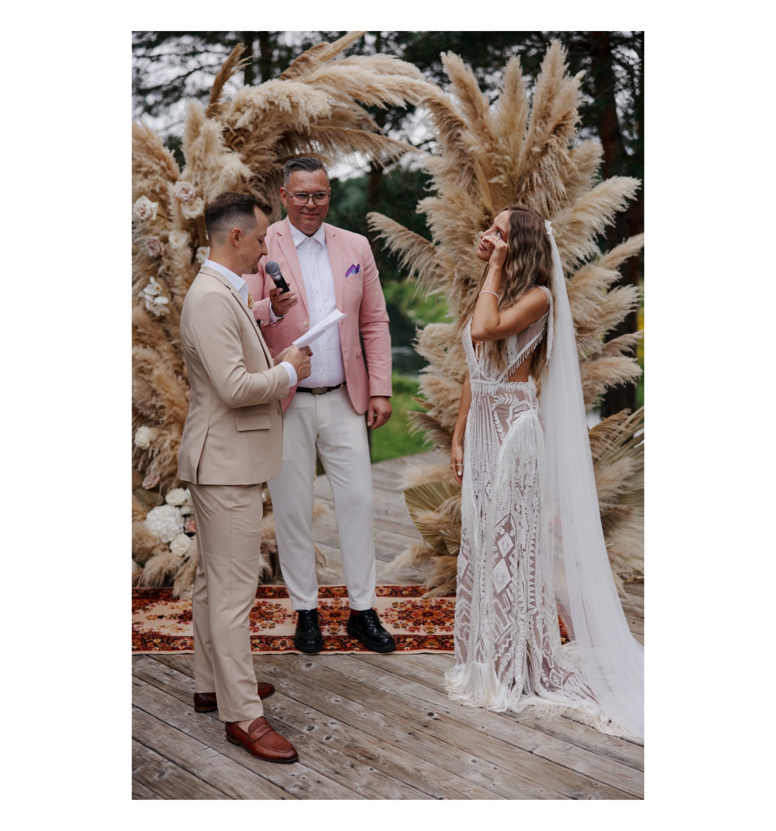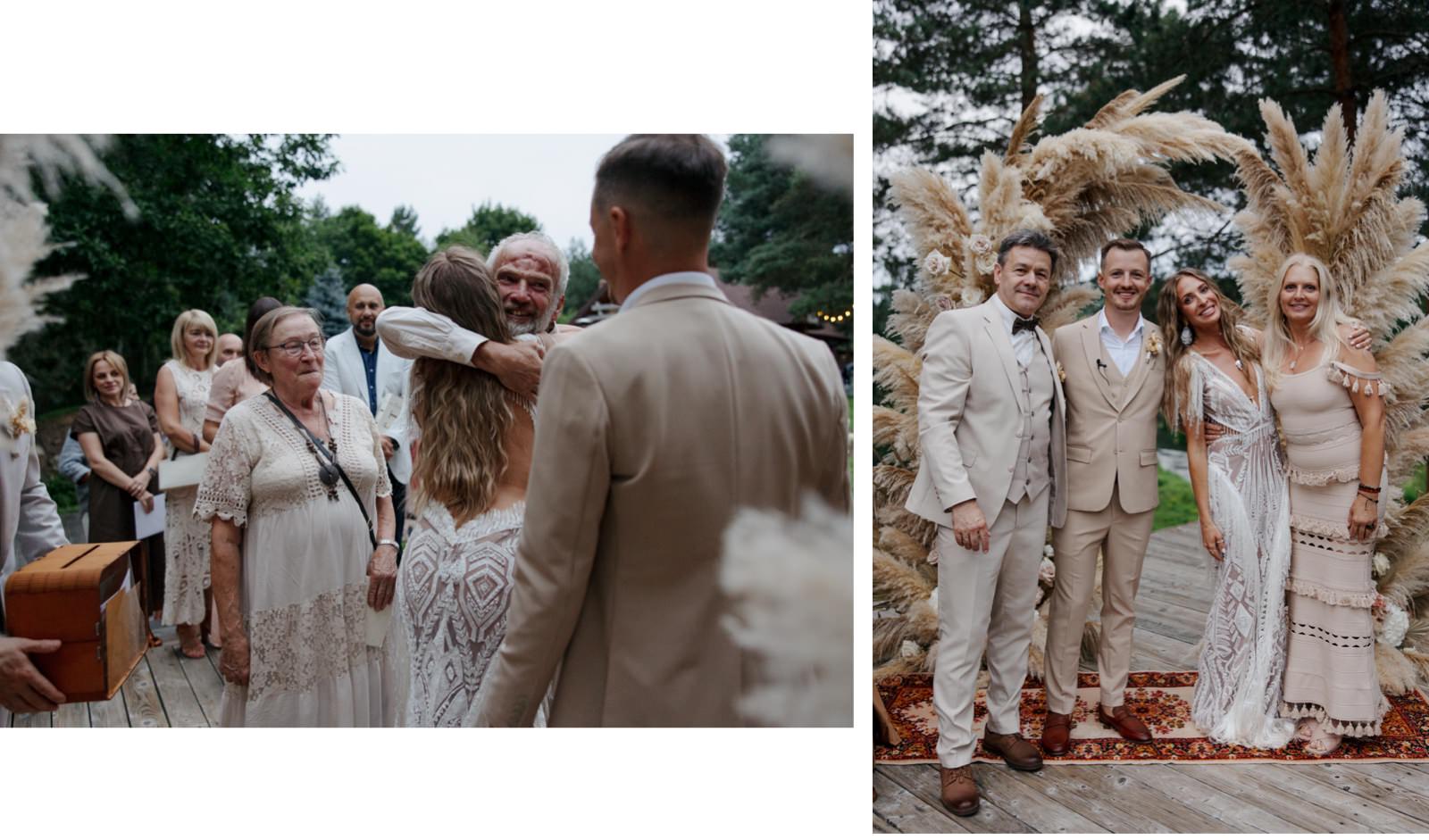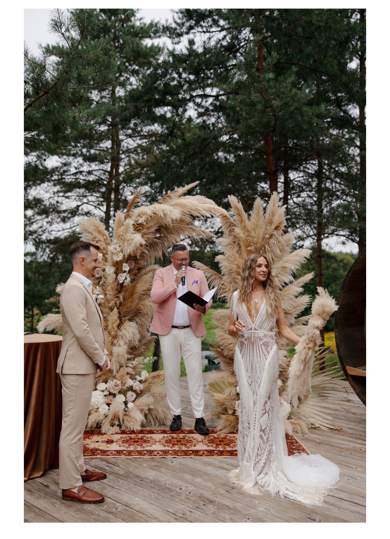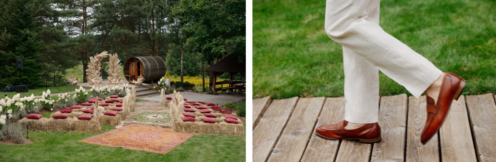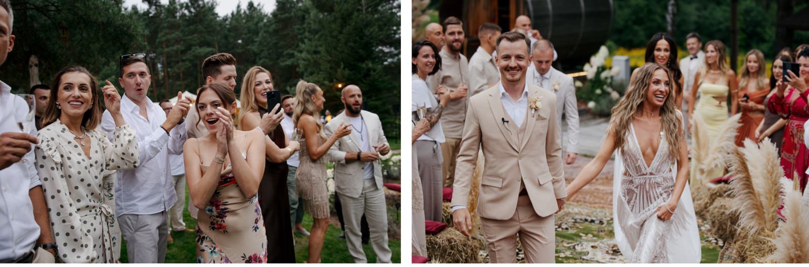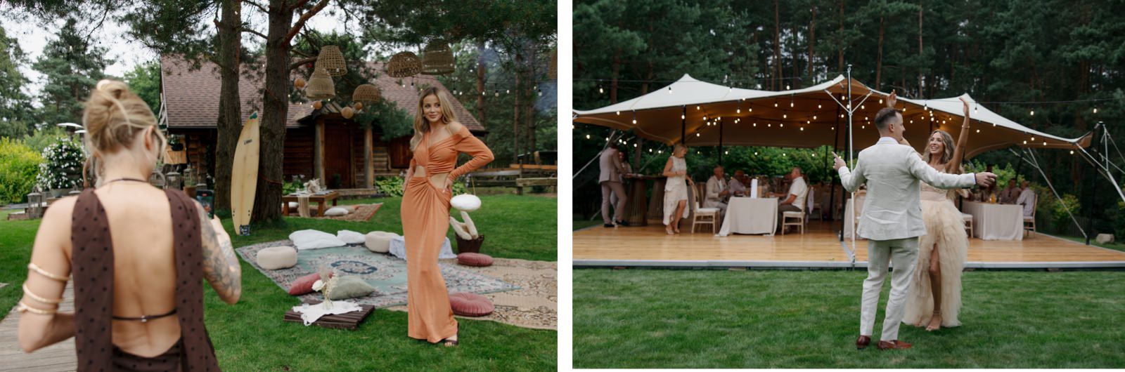 Był więc domek na drzewie, w którym przygotowywały się dziewczyny. Była najpiękniejsza panna młoda w najpiękniejszej sukni ślubnej boho z frędzlami i koronką. Zamiast tradycyjnego bukietu - wachlarz z trawy pampasowej. I pan młody w eleganckim beżu. Kompleksowo przygotowany teren na ceremonię przy ostatnich promieniach słońca, z widokiem na rzekę. Barwne dywany na świeżo skoszonej trawie, goście siedzący na snopkach siana. Tańce pod gwiazdami i totalny luz. Prywatna działka, basen i chill w rytmach elektroniki.