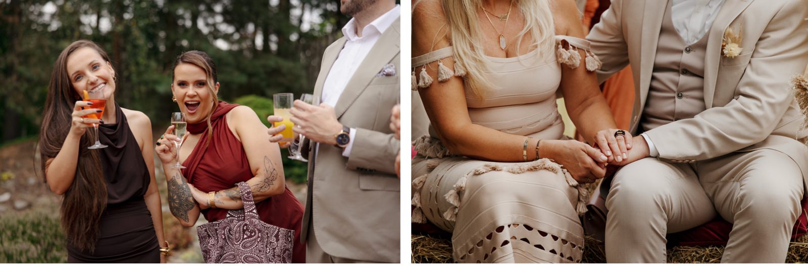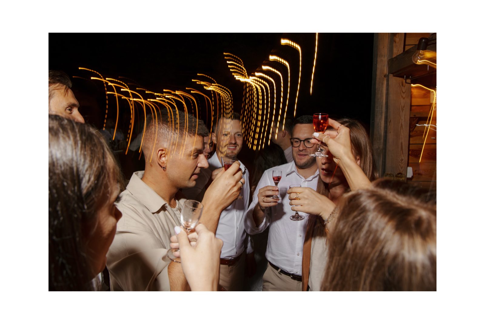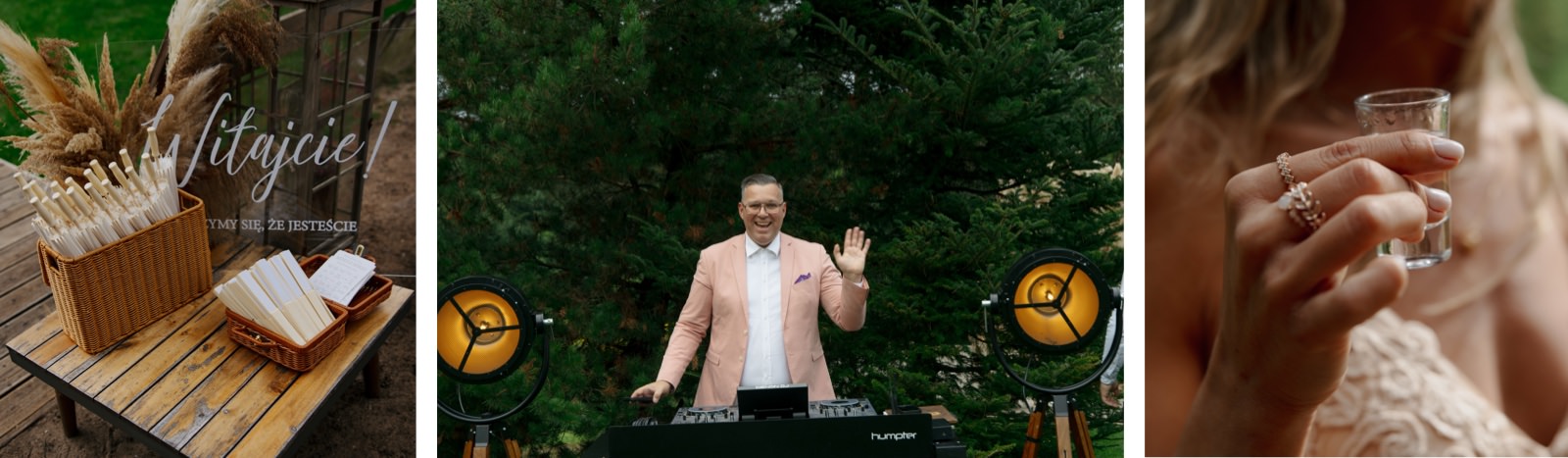 Zachód słońca, śpiew ptaków i lekki wiatr poruszający trawą tworzą atmosferę, której nie da się zaplanować w żadnej sali. To natura gra tu pierwsze skrzypce. Fantastycznym rozwiązaniem był koktajl dla gości przed ceremonią zaślubin. Dzięki temu para młoda miała dużo czasu, by każdego powitać, przytulić się i porozmawiać.